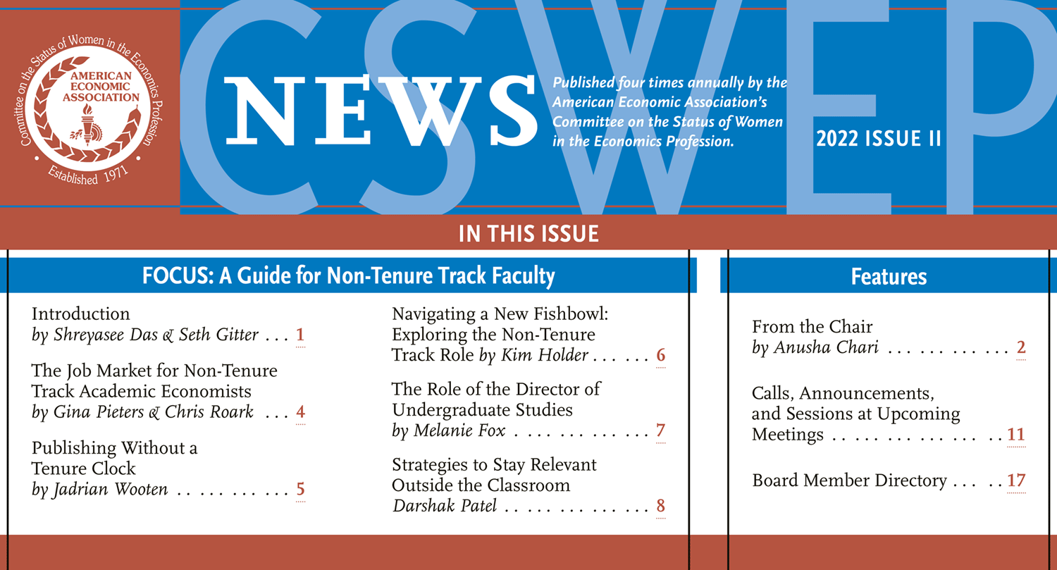 CSWEP produces professional development materials and career advice that are distributed widely to junior and mid-career economists. CSWEP's newsletter, published since 1972, has distributed findings from the CSWEP Survey, calls for CSWEP sessions and reports of committee activities, and career advice. Re-titled CSWEP News in Fall 2013, it is now published four times yearly and offers a Focus section of professional development articles written by senior economists and organized around a common theme. The first issue of the year contains the Annual Report and others feature interviews of recipients of the Carolyn Shaw Bell Award and the Elaine Bennett Research Prize.