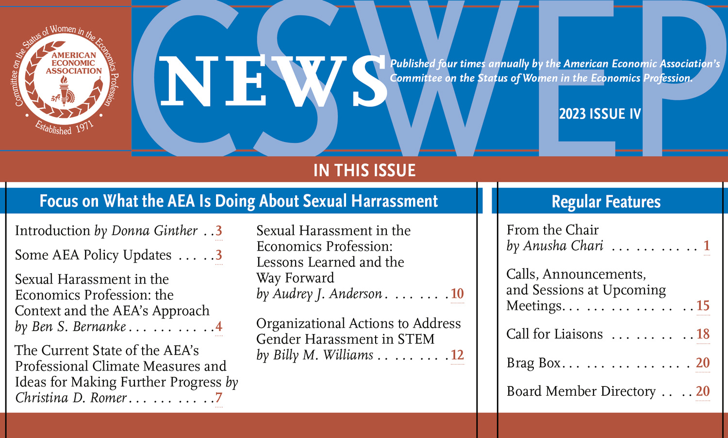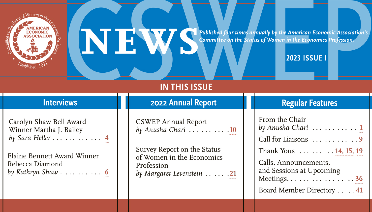The first issue of each year includes the CSWEP Annual Report and interviews with recipients of the Carolyn Shaw Bell Award, the Elaine Bennett Research Prize, and the Janet L. Yellen Award for Excellence in Public Service.