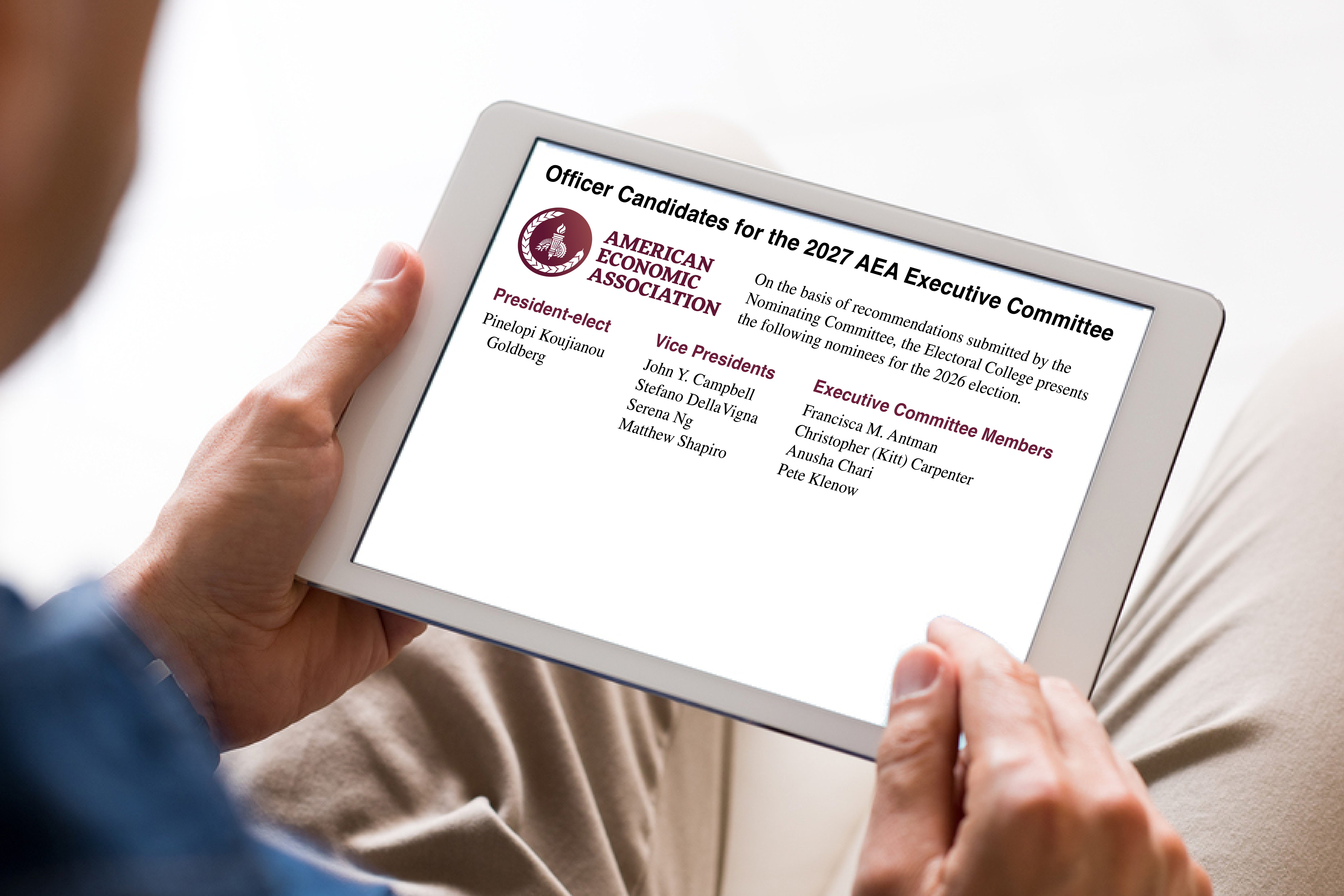 The Nominating Committee, consisting of Susan Athey (Chair), Amy Finkelstein, Linda Goldberg, Yuriy Gorodnichenko, Judith Hellerstein, David Laibson, Kevin Lang, and Trevon Logan, submitted its nominations for vice presidents and elected members of the Executive Committee on April 3. The Electoral College, consisting of the Nominating Committee and the Executive Committee's voting members together, then selected the nominee for president-elect.