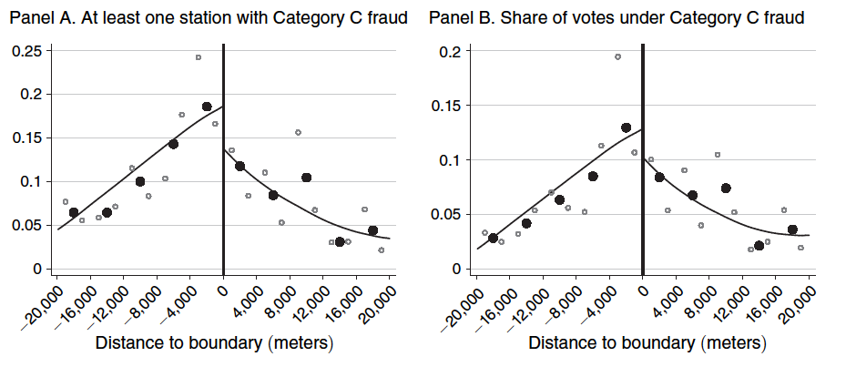 The figure below shows the effect that cell phone coverage had on election fraud. The negative "distances to boundary" on the left of each panel are areas outside the coverage area and positive distances are areas with coverage. Hollow dots are the average share of fraudulent votes for polling centers falling within 2,000-meter bins, and solid dots are 4,000-meter bins. The likelihood of a polling center reporting fraud drops by 5 percentage points (Panel A) while the average share of fraudulent votes drops by 2.5 percentage points (Panel B).