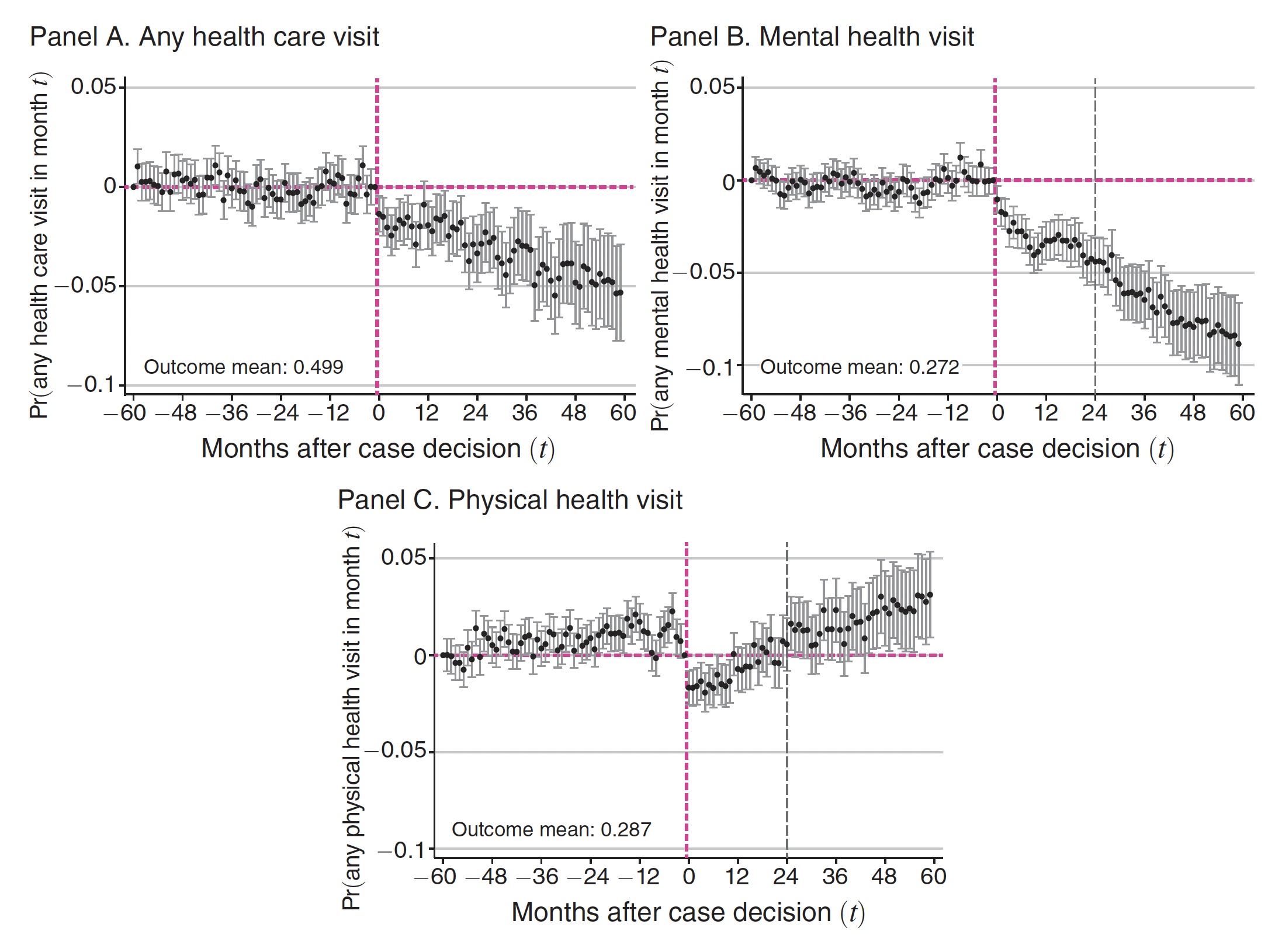 Before sentencing, health care visit patterns remain stable. After sentencing, there is a significant drop in mental health-related visits, leading to a 30 percent reduction in the probability of a visit by the five-year mark. Physical health visits, by contrast, show only a temporary decline during the first year of incarceration, followed by a slight increase afterward.