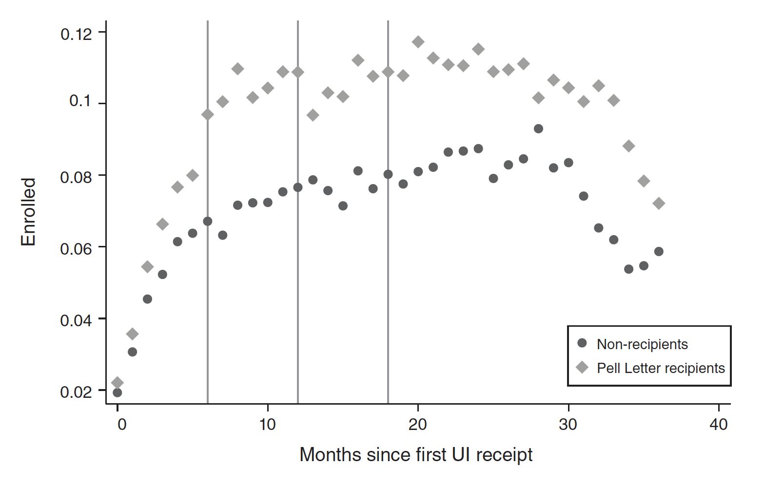 The chart above from their paper shows the fraction of UI recipients who were enrolled in school after an unemployment spell, called the enrollment rate. The light gray diamonds are enrollment rates for those who received a letter from their state government informing them about the Pell Grant Program and encouraging them to seek training. The dark gray circles are enrollment rates of those who didn’t receive a letter. The three vertical lines indicate six month increments. One can see a sharp increase in the share of enrollees in both the letter recipients and non-recipients over the first six months of unemployment. After six months, there is a clear divergence between the two groups that continues to persist.