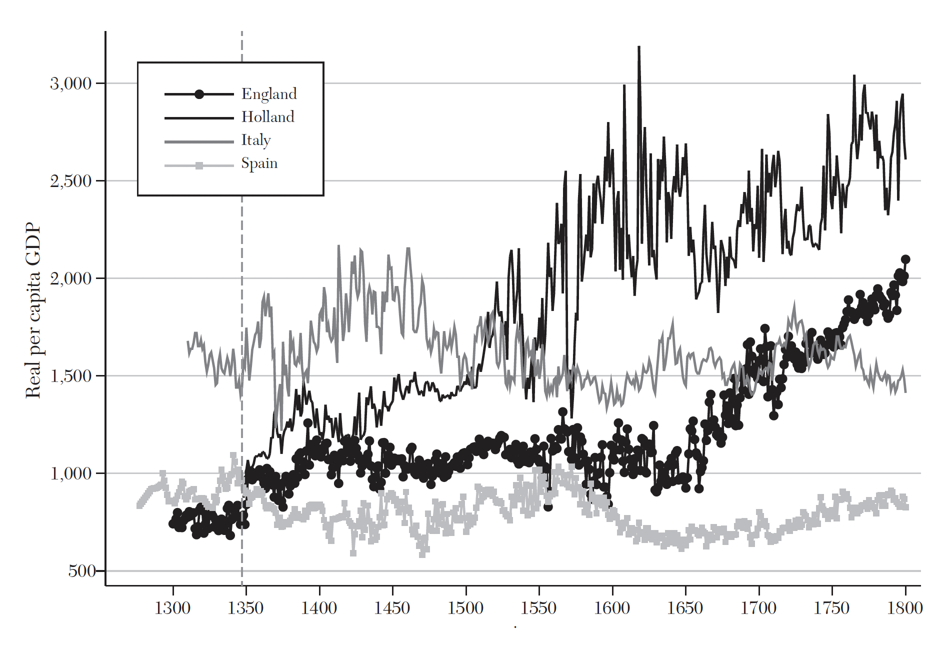 The chart shows estimates of GDP per capita in England, Holland, Italy, and Spain, before and after 1347 (dashed vertical line). Before the plague, northern Italy was the richest economy in Europe and possibly the richest economy in the world. While the region retained its economic lead over the rest of Europe in the century following the pandemic, the Netherlands and England began to catch up and eventually surpassed it.