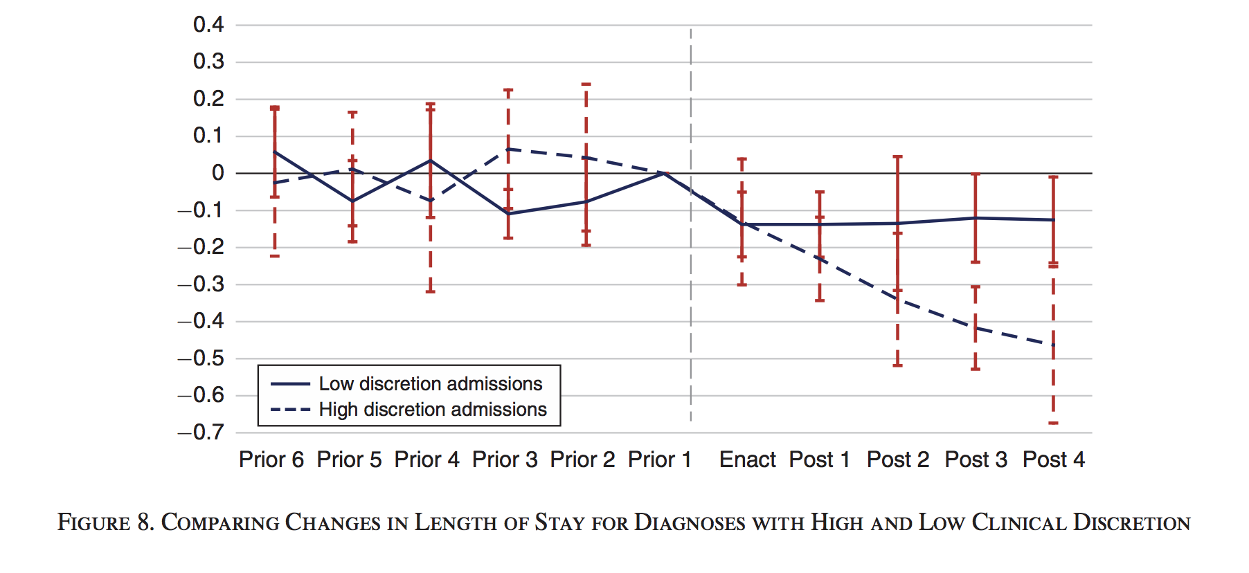 They find that hospitals did respond – the figure above shows that uninsured patients tended to get discharged from the hospital more quickly after these laws were introduced, which might be a bad sign.