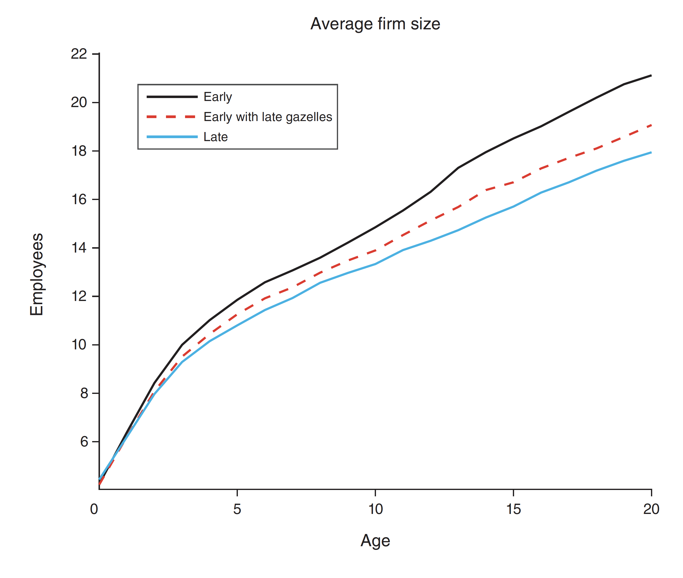The authors estimated what the company sizes in the early time period would have been if the early period had the same share of gazelles as the later period (indicated by the dashed red line). The gazelles alone accounted for roughly one half of the decline in firm sizes—even though among startups, the fraction of gazelles only declined from 6.4 percent in the early sample to 5.3 percent in the late sample.