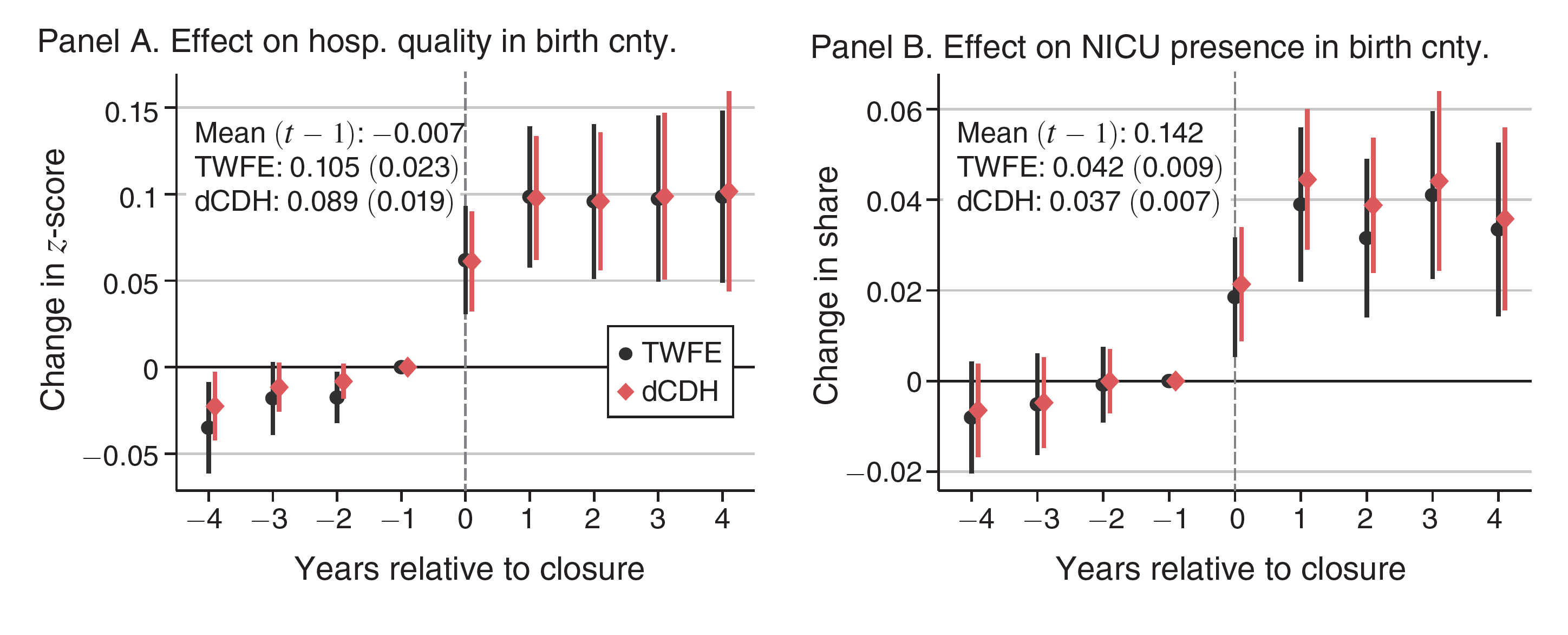 In the chart, the black series and the red series represent average estimates based on a two-way fixed effects estimator (TWFE) and de Chaisemartin and D’Haultfoeuille difference-in-differences estimator (dCDH), respectively. The vertical bars are 95 percent confidence intervals.