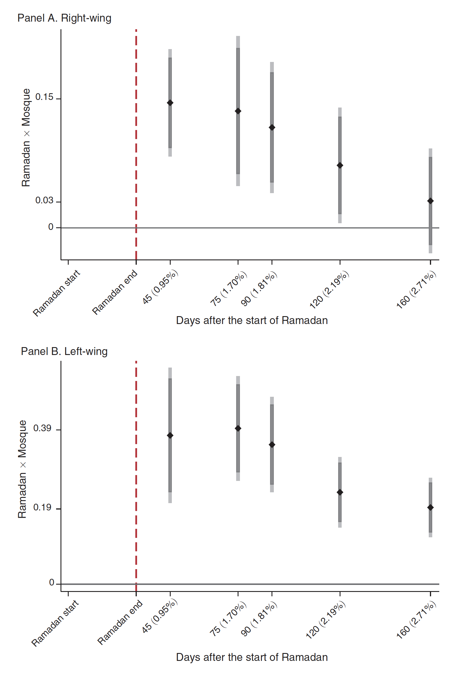 The black diamonds in the chart show a large boost for both the Left and the Right in elections between the start of Ramadan and 90 days after. But this effect gradually subsides as elections more than three months after the Muslim celebration are included in the estimate. The vertical light gray and dark gray bars denote 95 percent and 90 percent confidence intervals, respectively.