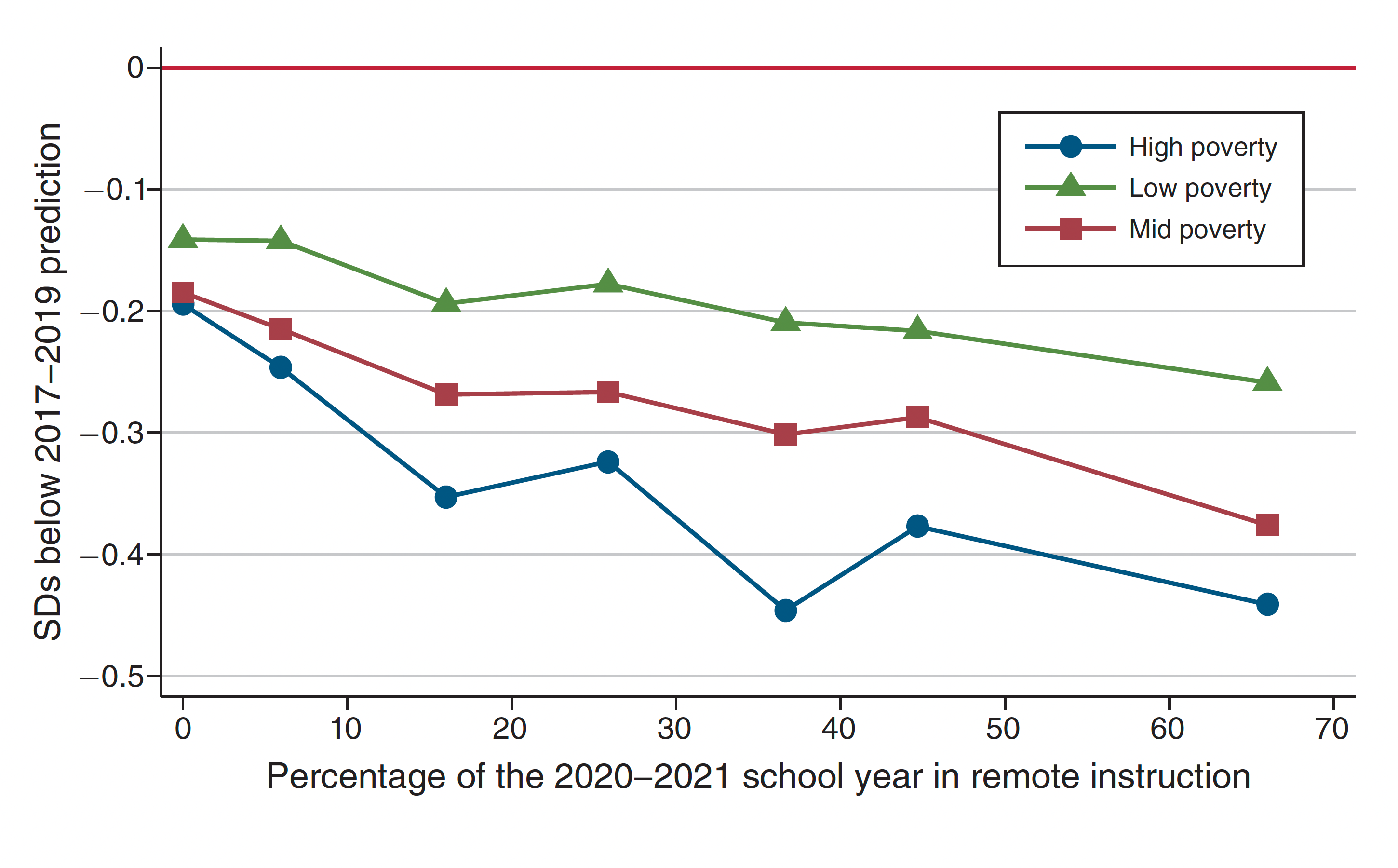 The x-axis indicates the percentage of the 2020–2021 school year that a school was in remote instruction. And the y-axis indicates the difference, in standard deviations, between student achievement growth from fall 2019 to fall 2021 and the predicted growth based on student growth from fall 2017 to fall 2019. The green triangles, red squares, and blue circles represent values for low-, middle-, and high-poverty school districts, respectively.