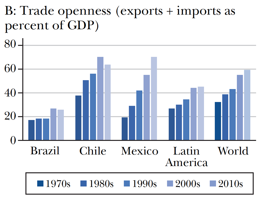 Panel B of figure 1 from the paper compares how the three countries performed relative to the broader region and world on liberalizing trade policy. The blue bars represent import–export activity as a share of GDP for each decade since the 1970s. Policymakers encouraged Latin American economies to embrace an open-economy strategy by lowering tariffs. Overall, Latin American countries largely followed suit. Chile and Mexico cut tariffs and signed free trade agreements with crucial partners, and both countries experienced sustained gains well into the 2000s. By contrast, Brazil maintained a largely protectionist stance—cutting tariffs, but keeping key import barriers in place—and has had little growth in import–export activity since the 1980s. As a region, Latin America has made steady progress in trade openness, but remains behind the rest of the world.