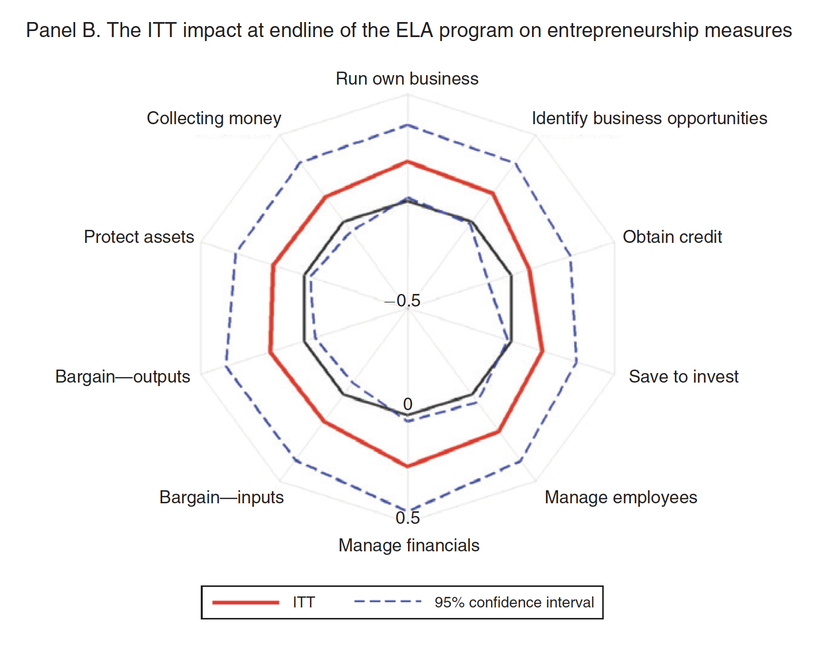 The red line represents estimates of changes in self-reported skills—on a scale from one to ten—4 years after the BRAC program. (ITT stands for intention-to-treat, an estimation method that accounts for attrition.) The blue dashed lines are 95 percent confidence intervals. The black line indicates zero on the graph.