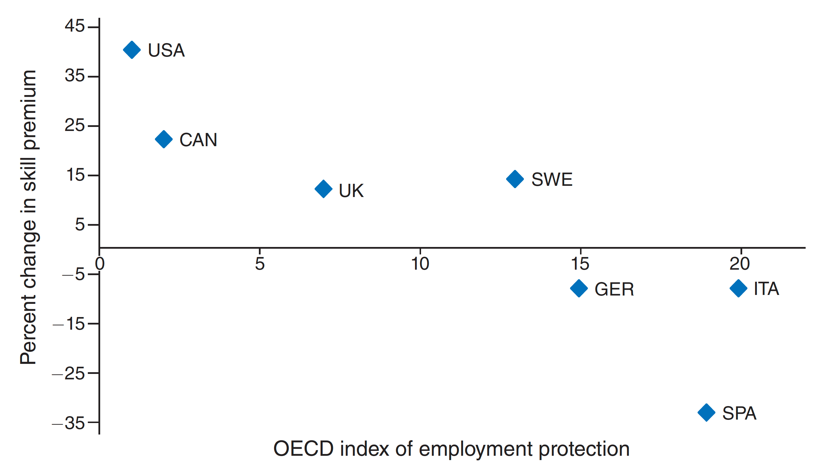 This means that when the economy overall is more volatile, stronger employment protections help keep workers and firms matched for longer and keep the wages of less educated workers from stagnating. As a result, the college wage premium doesn’t increase as quickly compared to countries with weaker employment protections.