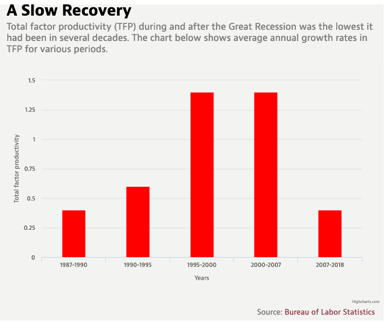 The drop in productivity after the Great Recession may be a result of a decline in productivity-enhancing investments.