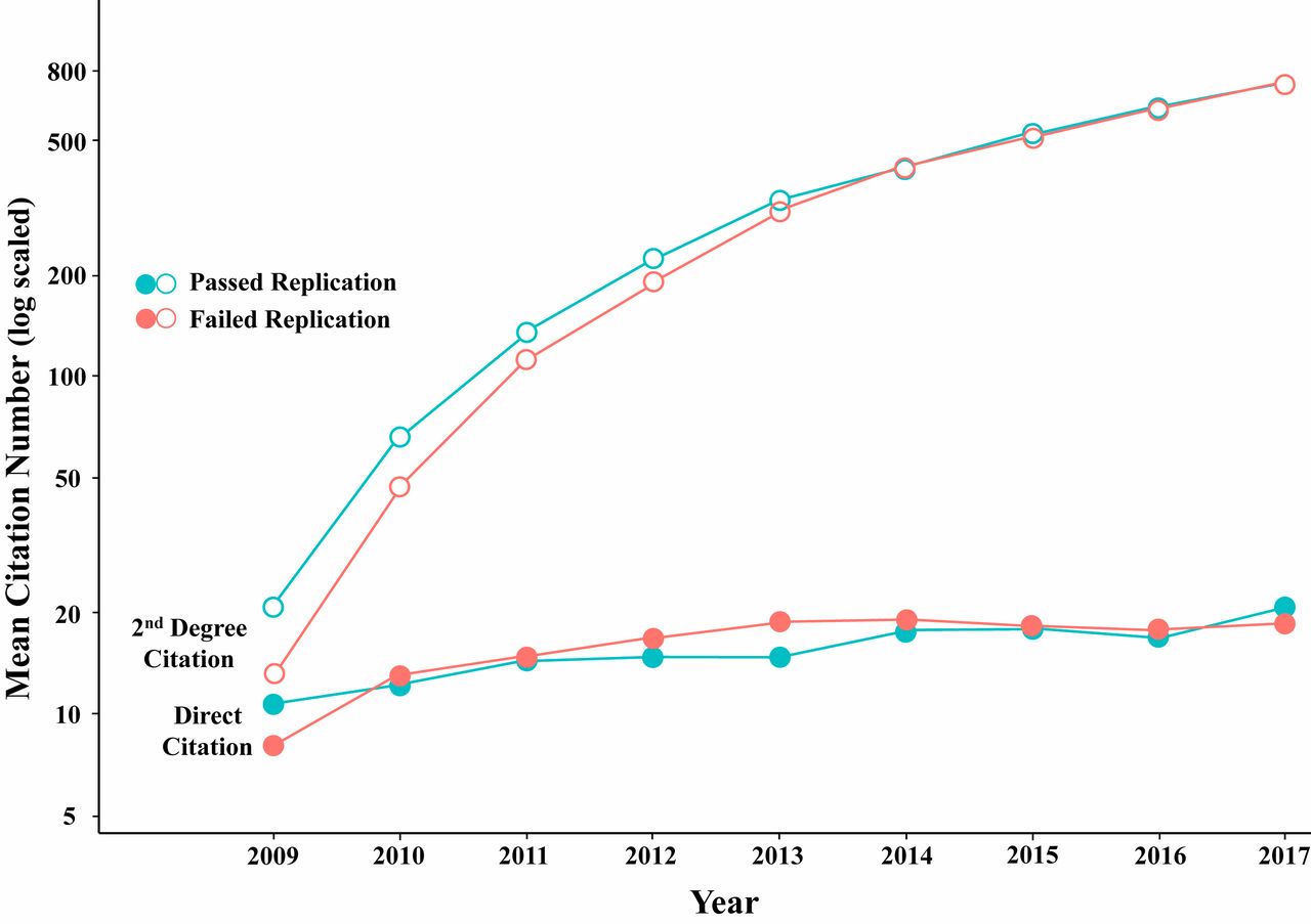 Findings that fail to replicate not only get published, but they get cited just as often as studies that pass replication. The chart below shows that citation rates for replicating and nonreplicating psychology papers published between 2009 and 2017 were indistinguishable.