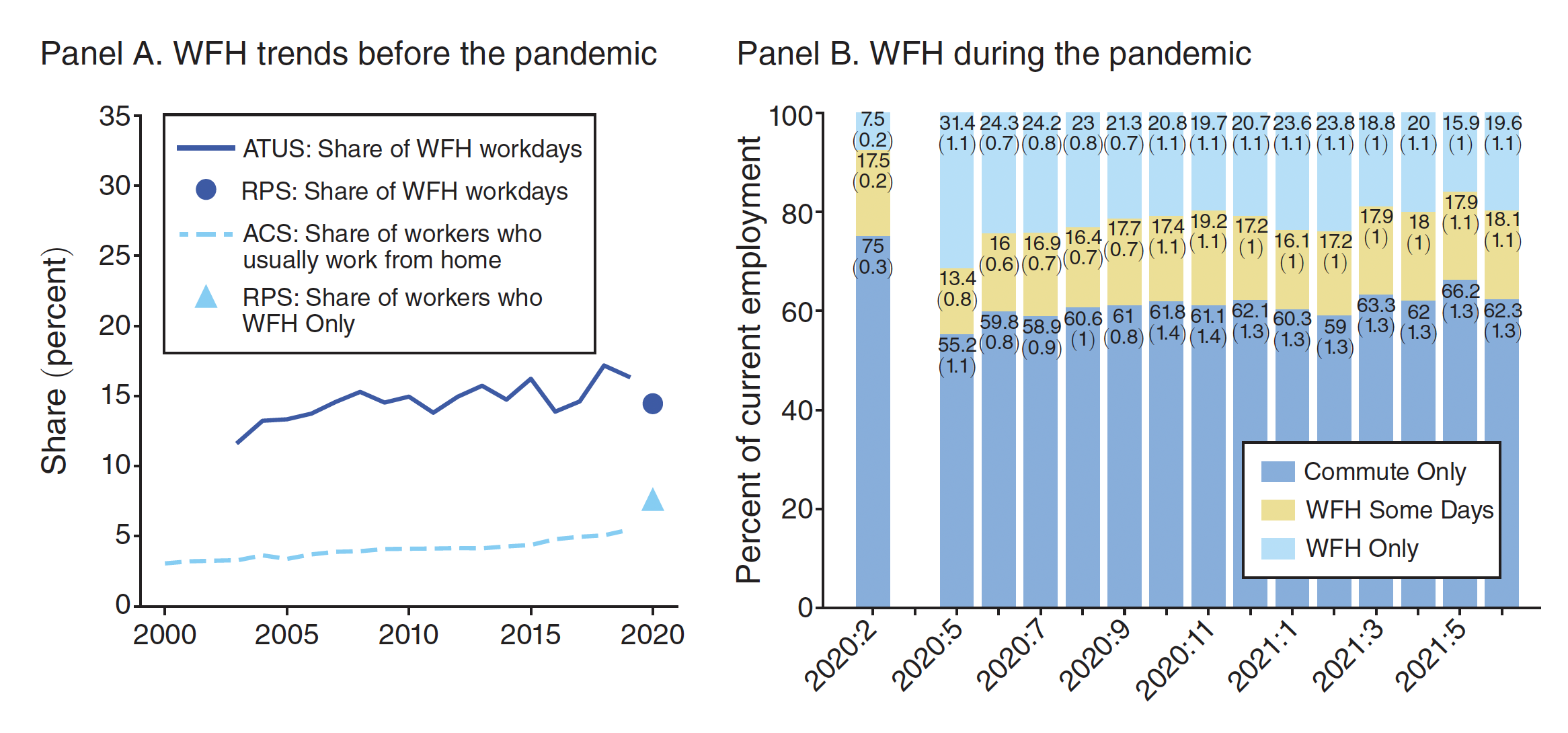 In a paper in the American Economic Journal: Macroeconomics, authors Alexander Bick, Adam Blandin, and Karel Mertens documented in real time the rapid increase in work from home over the pandemic and found that the forces that drove the changes are likely to persist into the future.